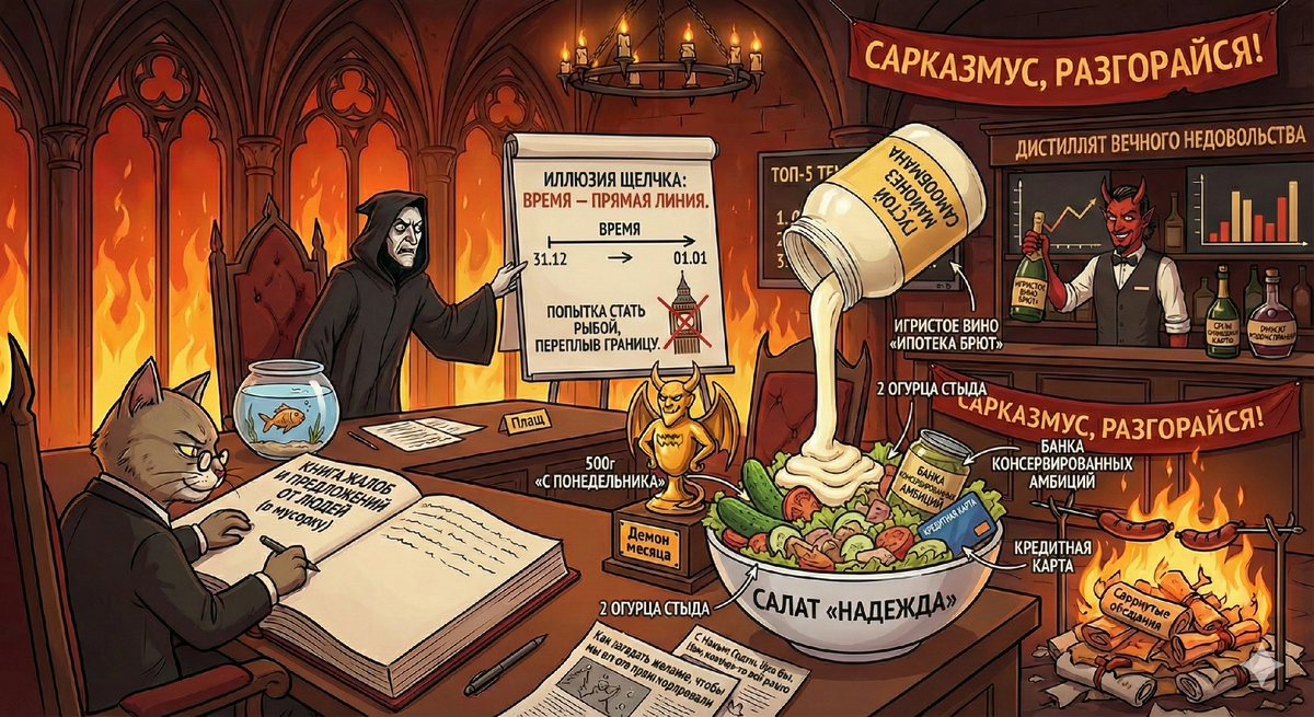 Научно-саркастический разбор магического мышления. Плащ доказывает, что время — это прямая линия, а не лестница с перилами из боя курантов. Кот сравнивает это с попыткой стать рыбой, переплыв условную границу в аквариуме. - «Салат «Надежда»: рецепт года из несбывшихся планов, залитых майонезом забвения».