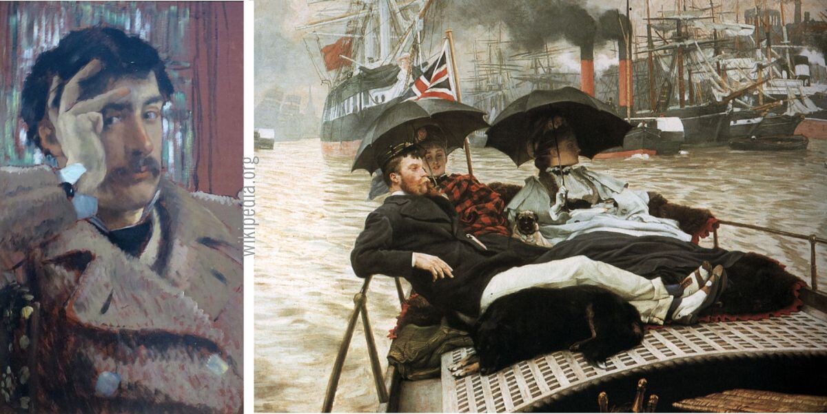 Джеймс (Жак-Жозеф) Тиссо (1836–1902) – французский живописец-импрессионист, значительную часть жизни работавший в Англии. Строгий критик, возможно, поморщится и воспримет его жанровые картины как салонную живопись, популярную в XIX веке, т.е. как нечто легкое, нарядное, бездумное. Я не строгий критик, и мне его работы нравятся: по-моему, они очень выразительны и, кроме того, их интересно рассматривать, так как в них содержится множество характерных деталей викторианской эпохи. Хорошая подборка работ художника есть в Википедии. Википедия