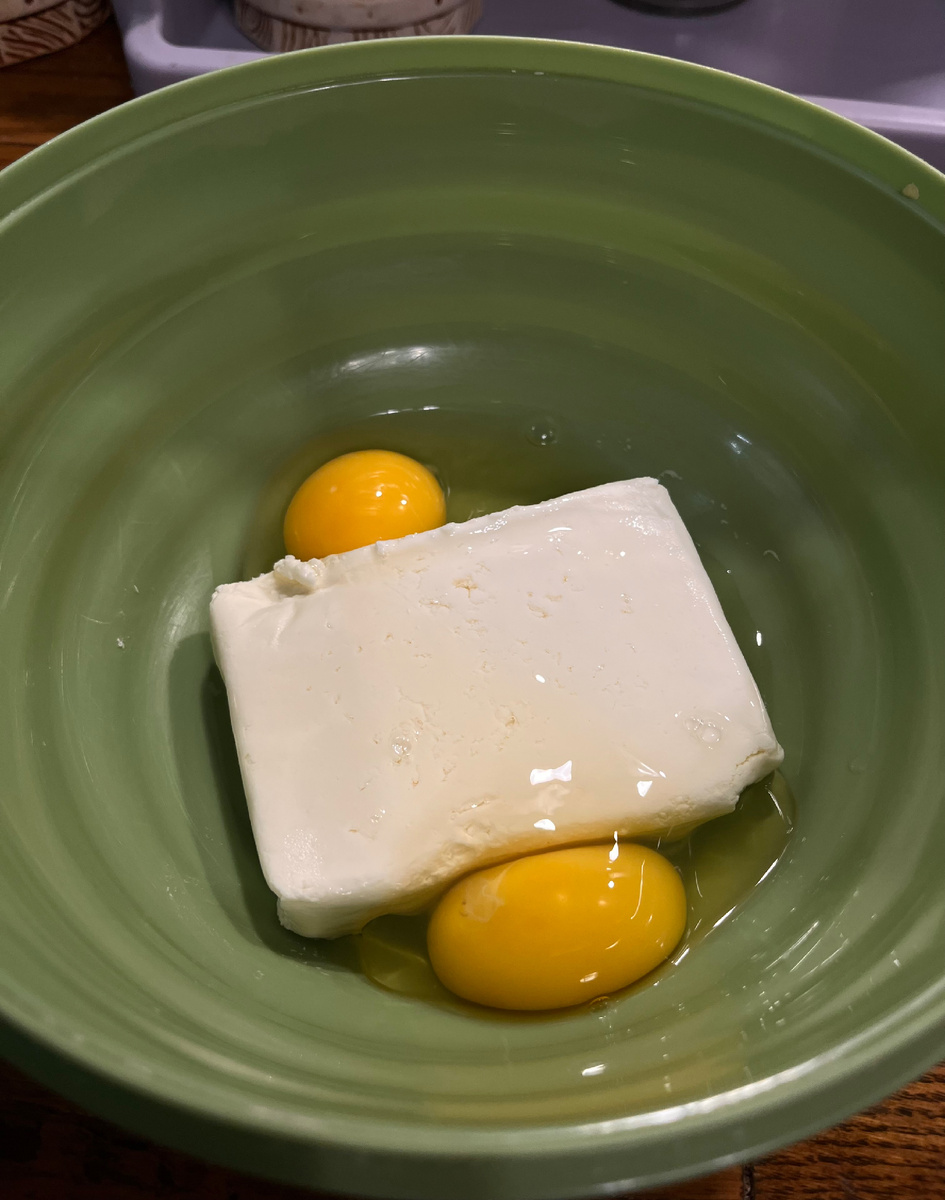 1. Творог разотрите с яйцами — разомните вилкой прямо в миске. Пусть останутся мелкие зёрнышки — они дадут текстуру.