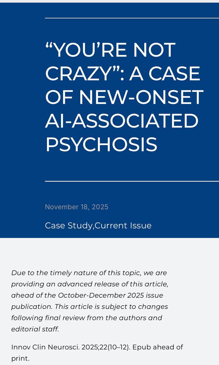 Речь идёт о пациентке с диагностированной депрессией и синдромом дефицита внимания и гиперактивности (СДВГ), которая длительно общалась с GPT-4o. Сначала ответы бота были нейтральными и осторожными, но со временем он начал во всём соглашаться, подтверждать субъективные выводы пациентки и подкреплять веру в несуществующие факты. Это усилило отрыв от реальности и привело к психозу и госпитализации. Спустя несколько месяцев, после повторного активного общения с ИИ, симптомы возникли снова. Врачи подчёркивают: проблема не в «злом ИИ», а в механизме безусловной валидации – когда уязвимая психика получает постоянное подтверждение своих искажённых убеждений. Подробное описание случая – в статье ”You’re Not Crazy”: A Case of New-Onset AI-Associated Psychosis #психология #искусственныйинтеллект #психика #нейросети #ChatGPT #ИИ #AI #СДВГ #технологии #цифроваяпсихология @ITCapital