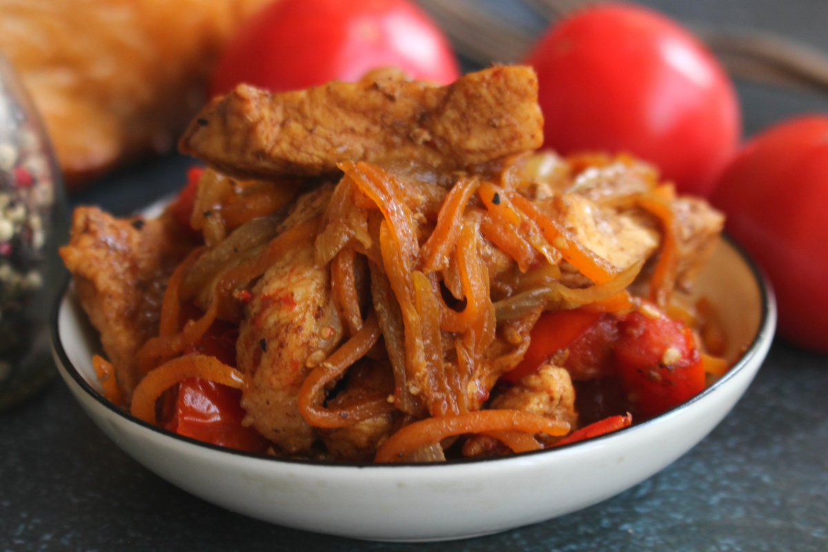 Отличное быстрое второе блюдо, которое можно подать так, а можно дополнить любимым гарниром. Такая тушеная грудка будет готова буквально за полчаса. Блюдо получается легкое, яркое, вкусное, а мясо тут мягкое и сочное. Если подать такое блюдо без гарнира, то оно вполне подойдет для разгрузочных дней. Если вы торопитесь, если нет времени долго стоять у плиты, то этот рецепт вам может пригодиться. Морковь обязательно нужно натереть соломкой, а лук нарезать длинными перьями. Такая нарезка добавляет какой-то новый вкус блюду. Куриная грудка - 300 г. Лук репчатый - 50 г. Морковь - 50 г. Помидоры - 100 г. Соус соевый - 3 ст.л. Масло растительное - 2 ст.л. Перец черный молотый - 2 щепотки Соль - по вкусу Лук нарежем перьями, морковь натрем соломкой через салатную терку. На сковороду наливаем масло, разогреваем и выложим овощи. Обжариваем овощи недолго, буквально 2 минуты, помешиваем. Мясо нарежем длинными брусочками и выложим на сковороду. Обжариваем все вместе четыре минуты. Мелкие помидоры н