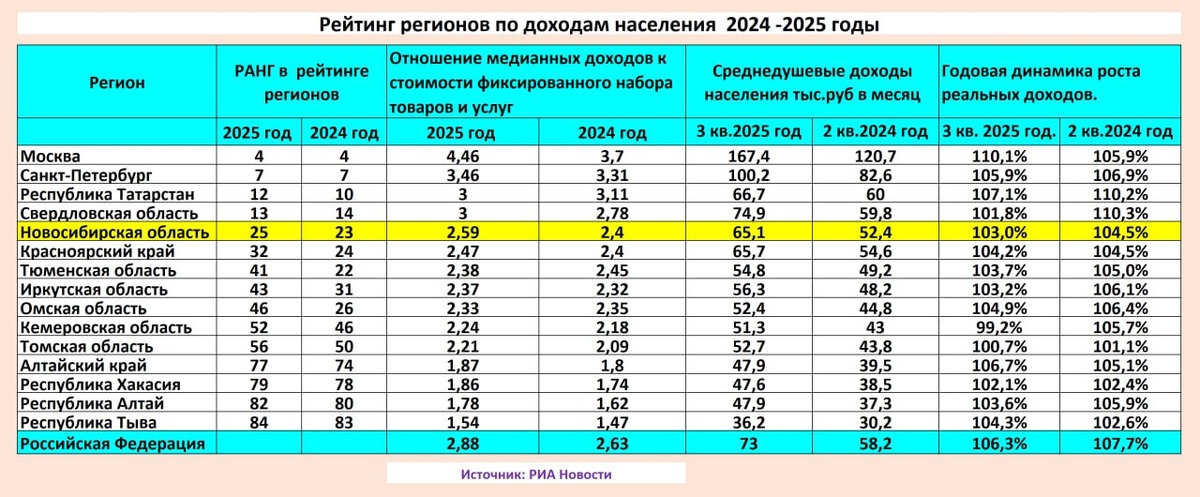 Эксперты «РИА Рейтинг» опубликовали перечень регионов по доходам населения по итогам III квартала 2025 года. 📌 В основе расчета лежит соотношение среднедушевого дохода населения региона и стоимости фиксированного набора потребительских товаров и услуг. В таблице указаны среднедушевые доходы населения по всем субъектам России с динамикой роста за последний год. Для более глубокого анализа я взял рейтинги за 2023, 2024 и 2025 годы. За два года Новосибирская область в рейтинге регионов потеряла 8 позиций и опустилась с 17 на 25 место. За последний год все субъекты СФО опустились в федеральном рейтинге регионов по уровню доходов населения. Самое большое снижение произошло в Омской области - 20 позиций и в Иркутской области — 12. ❗️Если сравнивать рост среднедушевых доходов населения с динамикой цен жилья на вторичном рынке, то видно, что реальная доступность жилья, без ипотечного плеча снижается в Новосибирской области два года подряд. За 2023 год цены на вторичное жилье выросли в Н