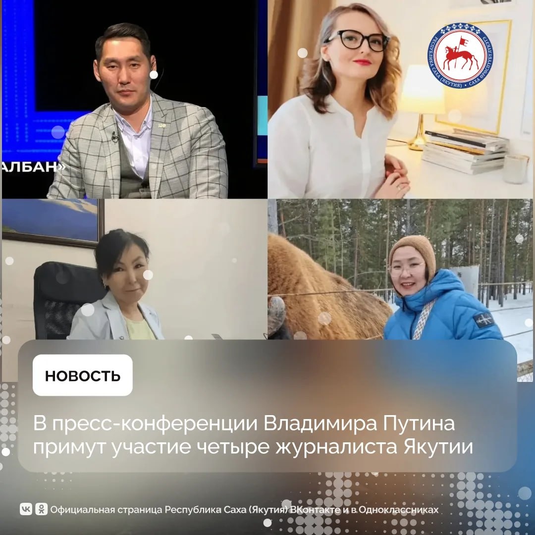 Глава государства в прямом эфире подведет итоги уходящего года и ответит на вопросы журналистов и россиян. 🔹 Свои вопросы Президенту РФ готовы задать и журналисты из Якутии. В мероприятии примут участие телеведущая ГТРК «Саха» Анна Ярыгина, журналисты НВК «Саха» Ирина Ефимова и Олег Колесов-Талбан, а также главный редактор районной газеты «Огни Нюрбы» Лена Петрова. «Наверное, нет журналиста, который бы не хотел побывать на пресс-конференции Президента и задать ему вопрос. Хочется верить, что нам выпадет такой шанс, ведь это возможность заявить о республике и решить один из интересующих якутян вопросов», – поделилась Анна Ярыгина. 🔹 Олег Колесов-Талбан отметил, что в этом году журналистов Якутии как никогда много на пресс-конференции Владимира Путина. «Впервые в истории нашей компании от НВК «Саха» нас двое. Это очень хорошо, так как увеличивает возможность задать вопросы Президенту. На таких пресс-конференциях давно не удавалось сделать это нашим коллегам из Якутии, поэтому на эт