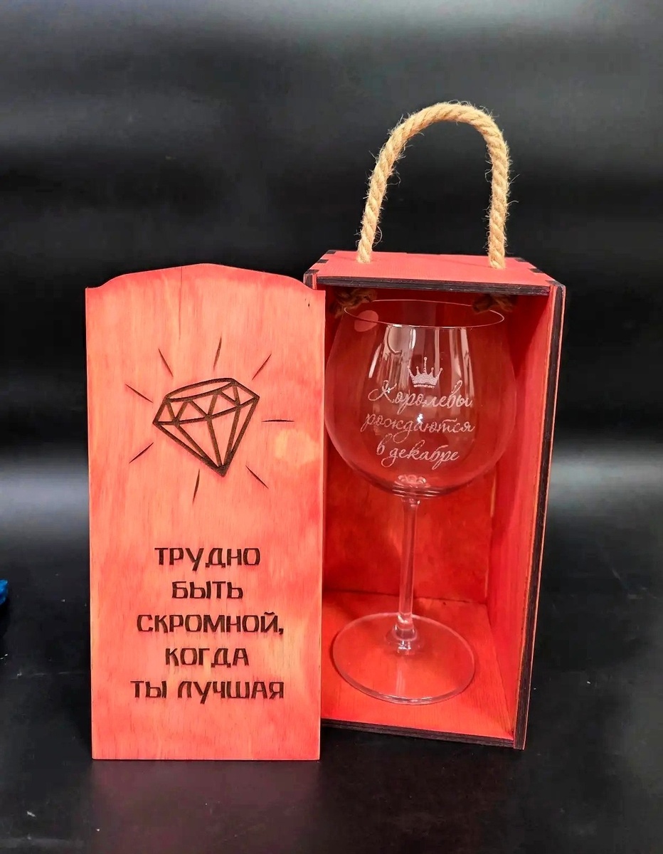 Большой бокал богемского стекла с гравировкой🍷 в подарочной коробке из дерева для девушки❤️