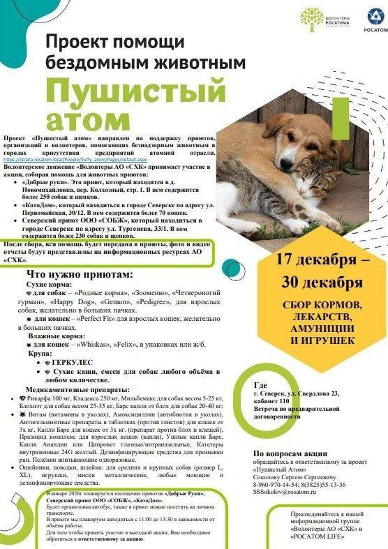 Добровольческое движение Сибирского химического комбината запускает в Северске благотворительную акцию «Пушистый атом». Цель — собрать помощь для подопечных трёх приютов нашего города и близлежащих территорий, где содержатся сотни кошек и собак. Среди тех, кому нужна наша помощь, — северский «КотоДом» с 70 кошками и местное ООО «СОБЖ», где живут более 230 собак. Также помощь пойдет в приют «Добрые руки» в Новомихайловке. Что особенно нужно? Корм (сухой, влажный, консервы, крупы), средства от паразитов, пеленки, амуниция (ошейники, поводки, шлейки размеров L, XL), металлические миски, а также любые моющие и дезинфицирующие средства. Где и когда принести помощь? Пункт приема: штаб молодежного движения (ул. Свердлова, 23, каб. 110). Предварительно нужно согласовать время по телефону: 55-13-36.