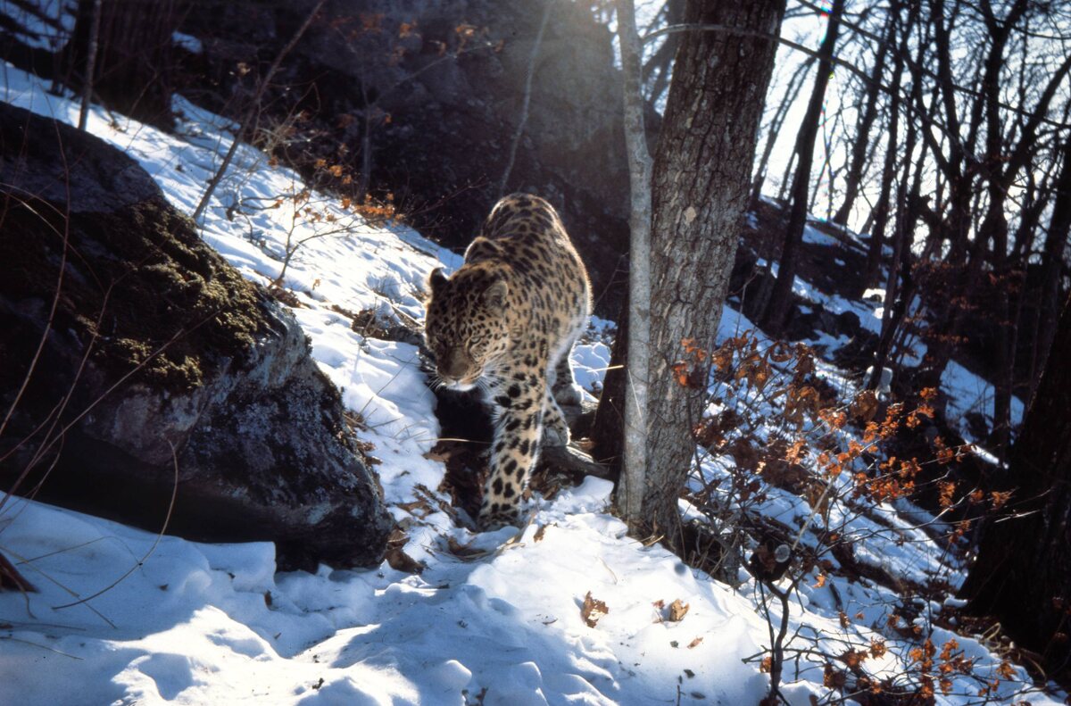🥲 Думаем, по выражению морды дальневосточного леопарда можно понять, что снежные тропы ему не особо нравятся. Этой фотографии более 20 лет, она была создана Юрием Шибневым ещё до изобретения фотоловушек в их современном понимании. Юрий смастерил самодельную фотоловушку из фотоаппарата «Любитель», к которому была прикреплена длинная леска. Касаясь её на тропе, зверь спускал затвор и фотографировал сам себя. Сейчас, благодаря его наследию, мы можем не только любоваться одними из первых профессиональных кадров этой большой кошки, но и видеть, что снег для леопардов всегда был чем-то не особо привлекательным. 🐆 Здесь «Земля леопарда»