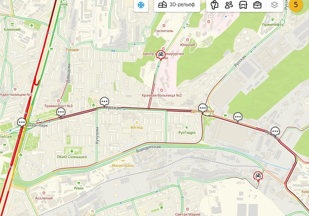 Жители Русской и близлежащих улиц оказались в огромной пробке, тянущейся аж до проспекта 100-летия Владивостока. По данным агрегатора 2gis, пробки здесь нет, но корреспондент @vladivostok1 собственными глазами увидел затор. А вот на проспекте 100-летия агрегатор показывает более реальную картину. Здесь вся дорога размечена в бордовый цвет, и автомобилисты оставили несколько негативных комментариев. Некоторые просто ругаются, а кто-то описывает обстановку. «50 минут стоим, 500 метров проехали. Вот это да, предновогодняя сказка», — написал раздосадованный автомобилист. Причем альтернатив у водителей нет: на объездной тоже образовалась пробка. Там произошло ДТП с участием большегруза и Honda Fit. Тяжелая ситуация наблюдается и на низководном мосту. Причиной проблем на дорогах стал внезапно выпавший ночью снег. Он начался примерно в 04:00, из-за чего во Владивостоке развернули штаб для отслеживания ситуации, а рабочие засыпали главные участки и перекрестки реагентами, но, как видно, э