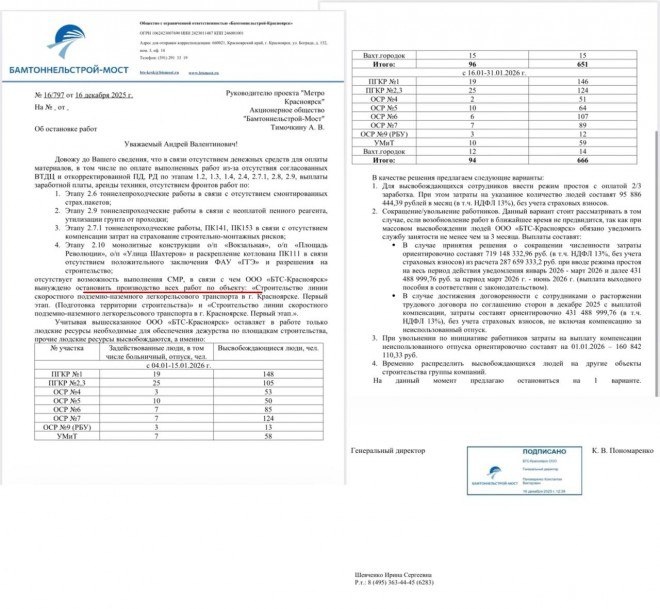 Один из субподрядчиков строительства красноярского метро сообщил о приостановке работ Субподрядчик строительства красноярского метро «БТС-Красноярск» предупредил о возможной остановке работ и массовом высвобождении сотрудников. По его словам, у подрядчика нет средств на оплату материалов, выполненных работ, выплату зарплаты и аренду техники, а также отсутствует фронт работ. Фото: Telegram-канал «Аксютенко Life» ТВК