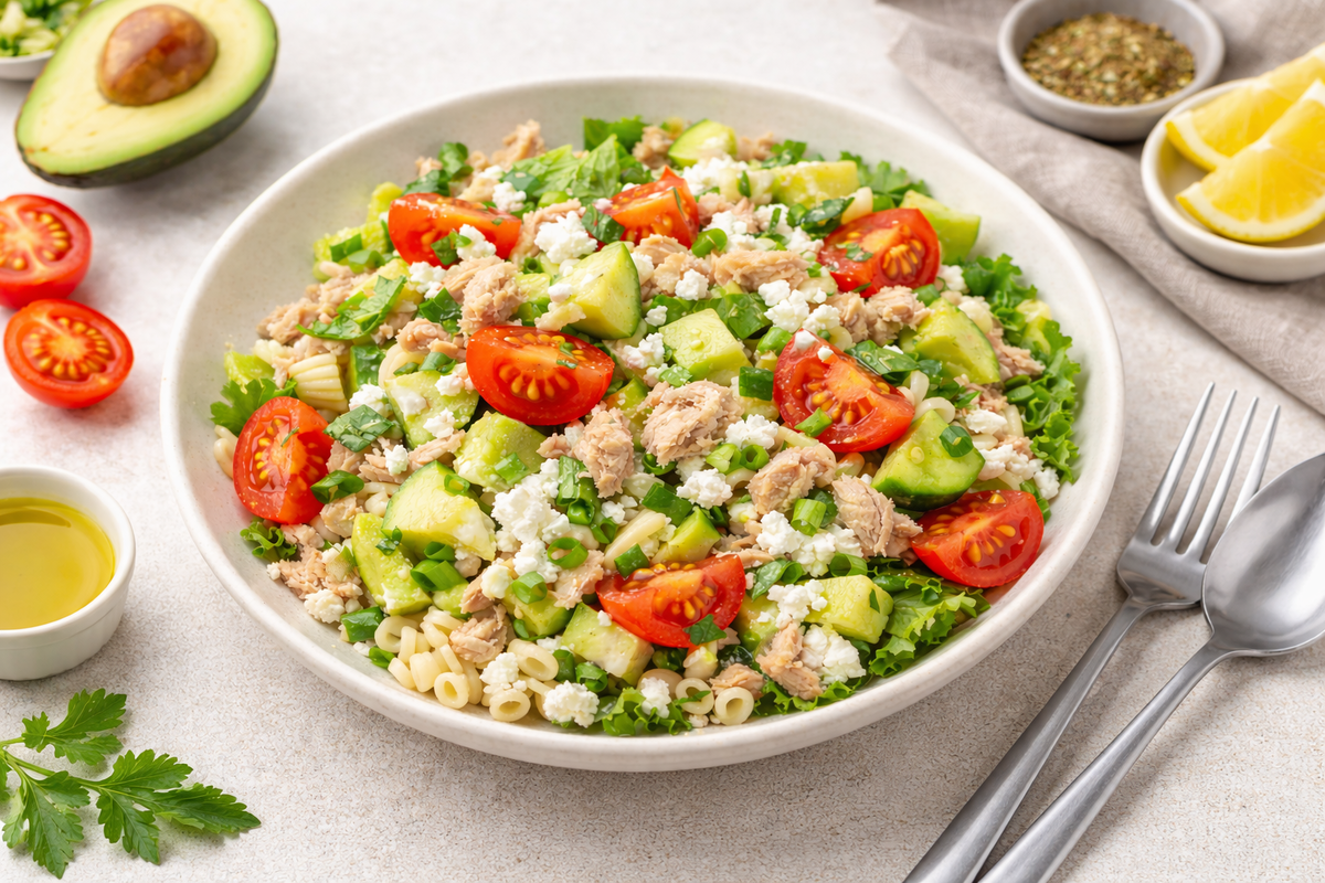 При диабете реакция на продукты индивидуальна — новые блюда лучше проверять глюкометром. 💡 Если есть возможность — макароны из чечевицы или нута подойдут ещё лучше. Отварите макароны al dente, слейте воду и полностью остудите. В этом рецепте можно использовать не только свежесваренные макароны, но и заранее отваренные и охлаждённые — например, оставшиеся со вчера. Это важно, потому что остывшая паста ведёт себя мягче по сахару. Овощи и зелень нарежьте крупно, тунец разберите вилкой. Смешайте макароны, творог или творожный сыр, тунец и овощи. Добавьте оливковое масло или кусочки авокадо.
