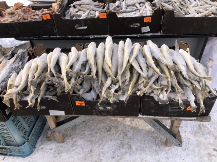 Классическая «ворошёнка» призывно сгрудилась на прилавках. Рядом – узнаваемые большие белые мешки с рыбой. Судя по внешнему виду, рыбка свежая, только что из моря – светлые брюшки у такой наваги с чуть заметным желтоватым оттенком.