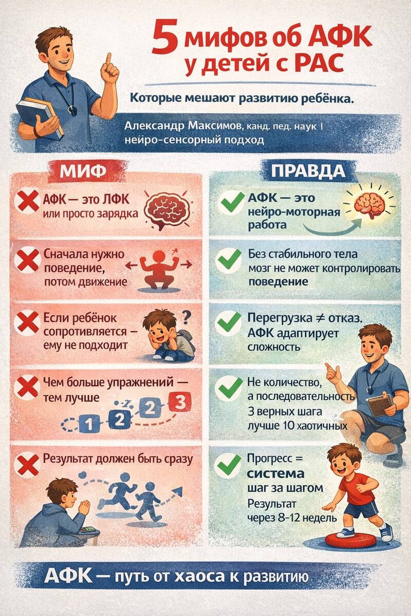 За 15 лет работы в адаптивной физической культуре я регулярно сталкиваюсь с одними и теми же убеждениями. К сожалению, именно они чаще всего тормозят прогресс. Разберём честно 👇 ❌ Миф 1. «АФК — это просто ЛФК или зарядка» Нет. АФК — это нейро-моторная работа, где каждое движение: — влияет на сенсорную интеграцию — формирует схемы тела — подготавливает мозг к обучению и коммуникации Если это «просто упражнения» — это уже не АФК. ❌ Миф 2. «Сначала нужно поведение, потом движение» На практике — наоборот. 🧠 Пока тело нестабильно, 🧠 пока ребёнок не чувствует опору, 🧧 мозг не может удерживать внимание и контроль. Поведение — это следствие состояния нервной системы. ❌ Миф 3. «Если ребёнок сопротивляется — значит не готов» Сопротивление ≠ отказ. Чаще всего это: — сенсорная перегрузка — непонимание задачи — слишком высокий уровень сложности Правильная АФК адаптирует нагрузку, а не «ломает» ребёнка. ❌ Миф 4. «Чем больше упражнений — тем лучше» Нет. Важно не количество, а: ✔ по