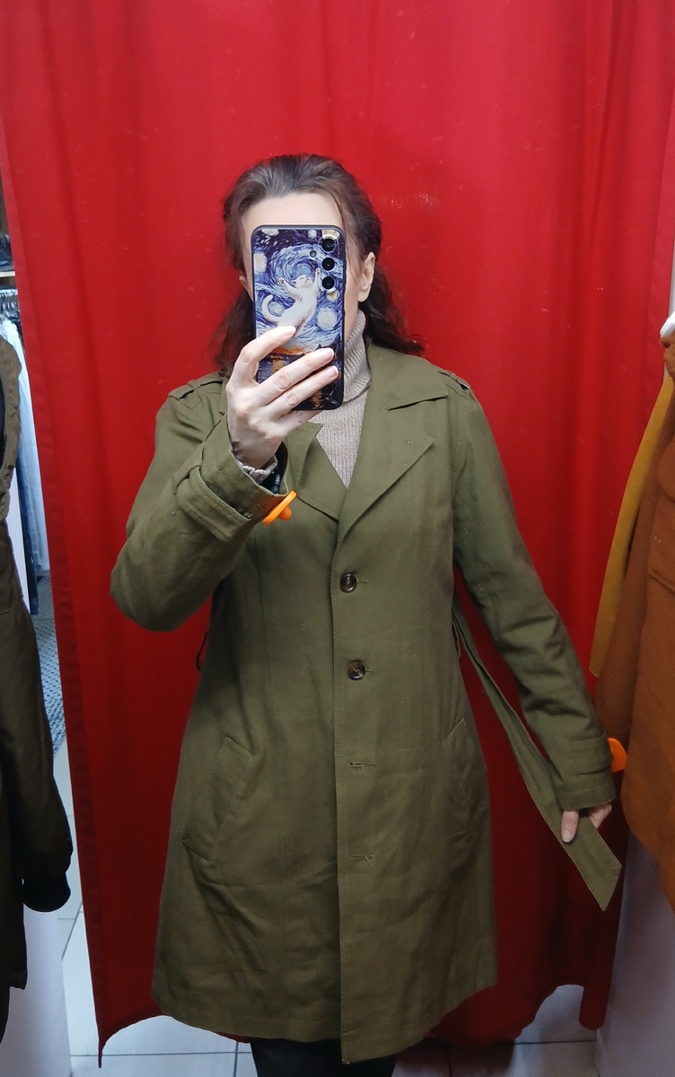 Здравствуйте. Конечно, я понимаю, что к праздникам всем нужно денег, даже мошенникам. На той недели написали, что надо перейти по ссылке из-за банковской карты. В выходные в мессенджере письмо, что на моих Госуслугах подозрительная активность и надо позвонить по телефону службы безопасности. Неприятно очень, заволновалась. Хорошо, что сын в этом шарит, посмотрел на всяких непонятных для меня страничках и оказалось, что активности у меня там нет уже несколько месяцев, вообще никакой. Вот так-то. Все хотят подарки и праздник за чужой счёт. Видимо у меня уже возраст располагает к наивности и доверчивости. Да мы олды, но скамить в преддверии такого милого праздника это кринжово)). А сыну такое не приходит, молодой, его фиг обманешь. Всё можно было купить по 590 рублей за кг. Плащ цвета хаки, ткань толстая и грубая, люблю такие вещи. Без пояса не смотрится совсем, рост не мой, а пояс пристегнут к плечу, без пояса халат какой-то получается((. По толщине ткани я назвала бы это пальто, а с