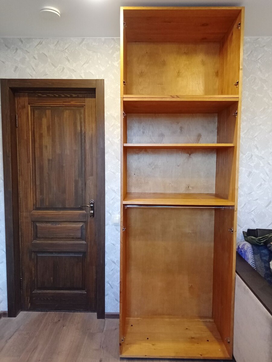 Шкаф вышел без каких либо изысков. Покрыл его морилкой и каким-то лаком, или яхтным или паркетным. Шкаф пережил даже то, что я его в одиночку запёр на второй этаж, чертыхаясь и матерясь. Спина правда это не оценила. Конструкция не совсем обычная, но для тех кому не стоит задача вешать пальто и платье по моему вполне не плохая в плане вместимости. Напихать в него можно кучу всего и даже ещё место осталось. Шкафчик я правда немного обновил, поменял ручки и петли установил с доводчиками.
