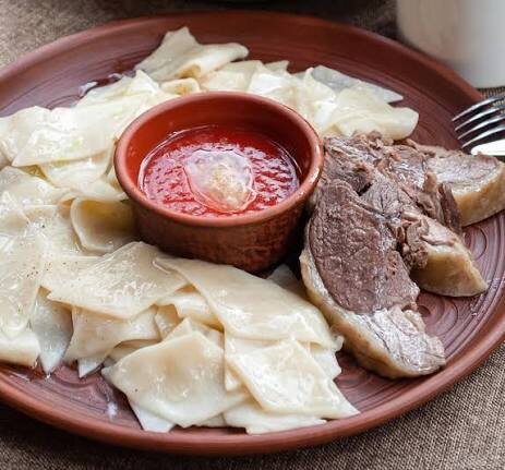 Воздушные хинкали, приготовленные на нежнейшем кефирном тесте, в дуэте с отварной говядиной – хинкал по-дагестански. Фишка блюда кроется в подаче, обязательным условием которой являются ароматные чесночные соусы: сметанный и томатный.