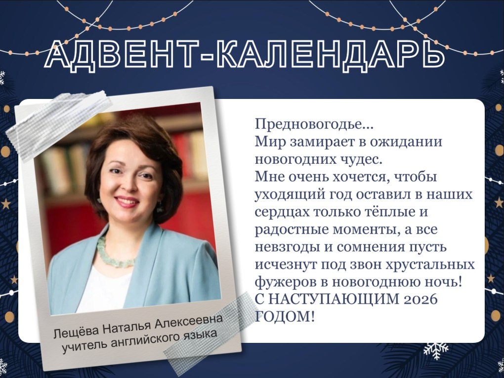! 🎄 А значит - снова открываем поздравление от наших учителей. Сегодня самыми добрыми словами хочет с вами поделиться учитель английского языка - Лещёва Наталья Алексеевна. А увидеть весь календарь можно по ссылке: https://vk.com/album-206909974_307859010 #ДОНМ #ШколыКолледжиМосквы