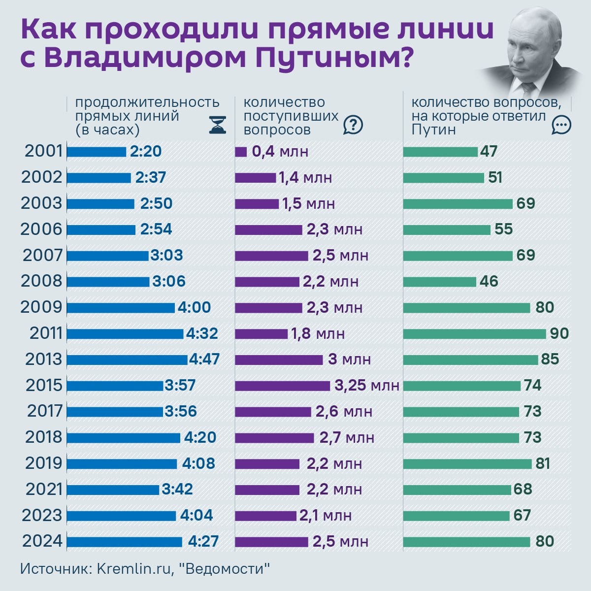 "Итоги года" с Владимиром Путиным: сегодня президент РФ традиционно ответит на вопросы россиян и журналистов. Смотрите трансляцию в нашем канале. А пока @Sputnik собрал для вас статистику ежегодных прямых линий президента. ▪️ Диалог с россиянами. Первая такая встреча состоялась 24 декабря 2001 года, хотя сотрудники Кремля отговаривали Путина от подобного публичного формата. В тот же год прошла и первая большая пресс-конференция для журналистов. Долгое время эти мероприятия существовали раздельно, но с 2023 года их объединили в единый формат "Итоги года". ▪️ Обращения граждан. За годы существования этого проекта президент суммарно общался с гражданами почти 78 часов, ответив на свыше 1460 обращений. Самый долгий эфир зафиксирован в 2013 году (4 часа 47 минут), а больше всего вопросов (более 3,2 млн) поступило в 2015 году. ▪️ Растущий интерес. Если в 2001 году поступило около 400 тысяч обращений, то в 2024 году их количество достигло 2,5 млн. Также стабильно растет и аудитория: в 2024 го