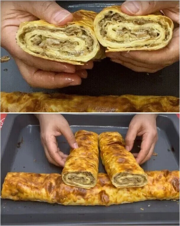 Аналогично готовим второй рулет, выкладываем на противень к первому. Смазываем поверхность рулетов сметанным соусом.