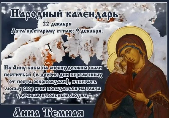 Женщинам нельзя ходить с распущенными волосами — в них может запутаться нечисть По народному поверью, 22 декабря 2025 года отмечается день святой Анны Темной, когда православные христиане чтят память святой Анны, матери Пресвятой Богородицы, в день ее чудесного зачатия. Согласно легенде, Анна и Иоаким долгое время оставались бездетными, но в один прекрасный день произошло чудо. Ангел явился Иоакиму с вестью о том, что его супруга подарит ему дочь, и его слова сбылись. Анна зачала и родила Марию, ставшую впоследствии матерью Иисуса Христа. В народном календаре считается, что с момента зачатия святой Анны наступают самые сильные холода и самые темные дни в году. День Анны Темной также совпадает с самым коротким днем года - зимним солнцестоянием. Народные приметы гласят, что если в день Анны Темной деревья покрыты инеем, то следует ожидать скорых и сильных морозов, которые, в свою очередь, предвещают богатый урожай. Если снег лежит у забора плотно, то лето будет неудачным, а если с просве