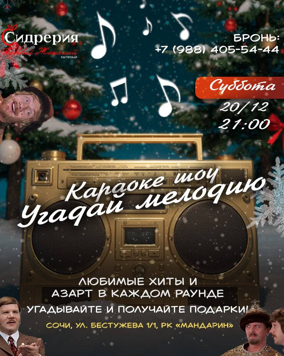 "🎄🎙 20.12 СБ | 🕘 начало в 21:00 Ждем тебя на зажигательное шоу - где азарт и веселье шагают в ногу! 🎤✨ 🎶 Узнавай хиты с первых нот 😂 Участвуй в конкурсах и музыкальных дуэлях 🍸 Пробуй сезонные коктейли, фирменный сидр, пиццы и пасту 🏆 Получай подарки, если ты самый быстрый и музыкальный ✨ Атмосфера вечера — яркая, теплая, громкая и очень веселая! А так же, тебя ждут наши новогодние предложения: 🎁 -10% именинникам 🍎 Фруктовая тарелка при бронировании до 20:00 🧃 Башня фирменного сидра при депозите от 5000₽ для компаний 🍕 Пицца в подарок при брони от 4 человек (Акции не суммируются) Забронировать столик: 🤍+7 (988) 405-54-44 🤍Сочи, ул. Бестужева 1/1, РК «Мандарин»