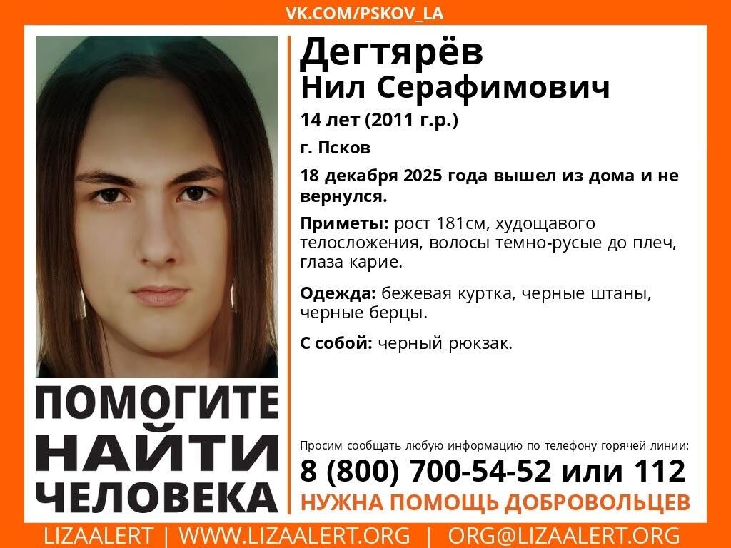 🚨 Поисковый отряд «ЛизаАлерт» Псковской области ищет пропавшего 14-летнего Нила Серафимовича. ⚠️ Подросток вышел из дома 18 декабря 2025 года и не вернулся. 📞 Информацию о пропавшем можно сообщить координаторам: Анна (Лютик): +7 (911) 367-28-58, Мария (Мася): +7 (911) 373-87-02 👉Подписывайтесь на ВЛуки.ру