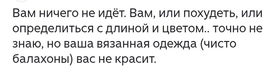 У меня на канале закреплена статья, где я показываю свой вязаный гардероб на 68-й размер без прикрас. Комментариев много, и они разные. В том числе такие: