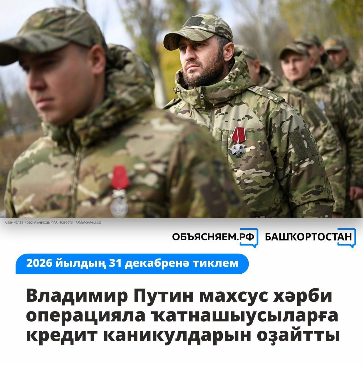 Рәсәй Президенты Владимир Путин махсус хәрби операцияла ҡатнашыусыларға һәм уларҙың ғаилә ағзаларына кредит каникулдарын тағы бер йылға