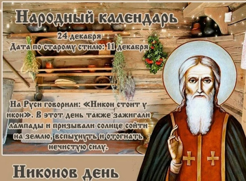24 декабря в православном календаре – день памяти нескольких святых: Даниила Столпника, Луки Столпника и Никона, монаха Киево-Печерской обители. В народном календаре этот день известен как Никонов день. В Никонов день: обычаи и верования. В этот день обращались с молитвами к святому Никону, прося об очищении души и защите от нечистых сил, которые, по поверьям, пытаются проникнуть в дом вместе с зимней вьюгой. Древние славяне 24 декабря зажигали светильник, чтобы усилить свет и призвать солнце спуститься на землю, чтобы рассеять тьму и отогнать зло. Существовало поверье, что до тех пор, пока солнце не коснется земли, ведьмы будут летать в небе, поднимая снежные вихри. В кружащемся снежном вихре наши предки видели злого духа, стремящегося попасть в дом и согреться у огня. Чтобы не допустить проникновения нечистой силы, у входа клали топор лезвием вверх. Иногда снежные вихри использовали и в благих целях – для избавления от болезни или любовного приворота. Заговор против лихорадки. Рано