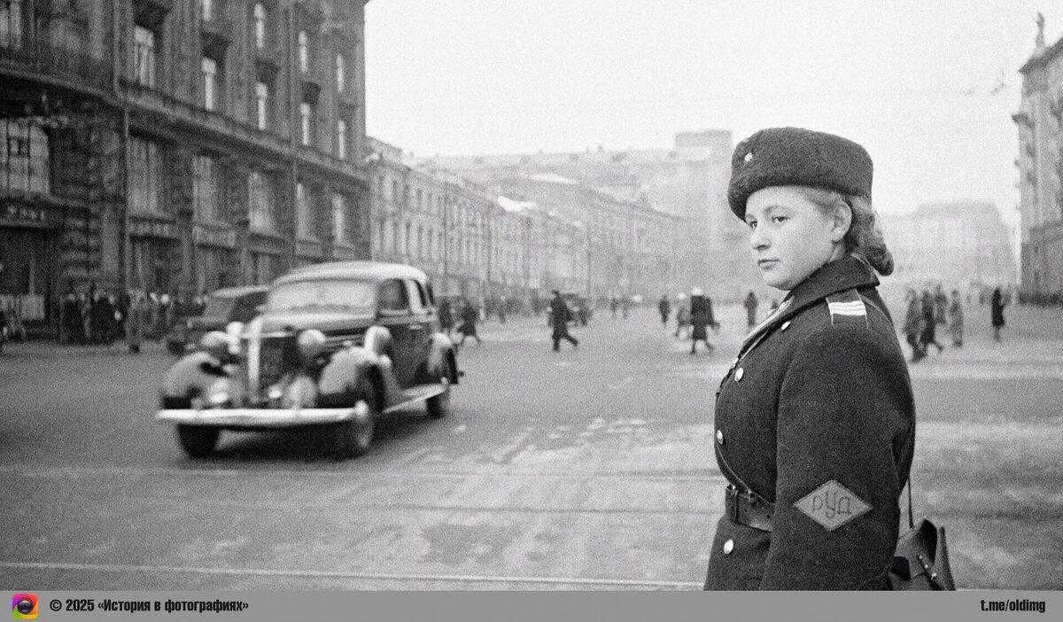 Женщина-регулировщик движения на улице Охотный ряд в Москве, 1943 год