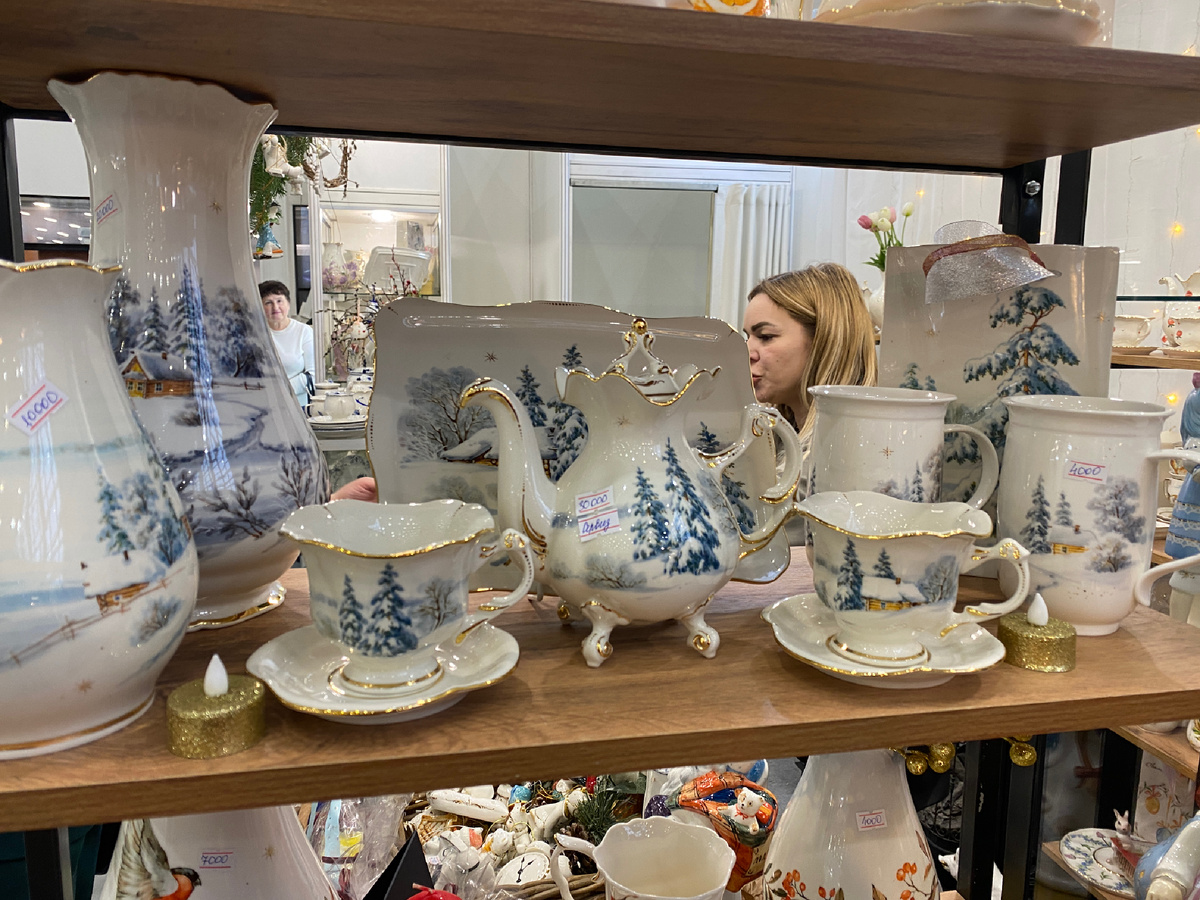 У Гжели было сервировочное блюдо в форме елки, расписанное праздничными поездами. Стоило, не соврать, тысяч семь.