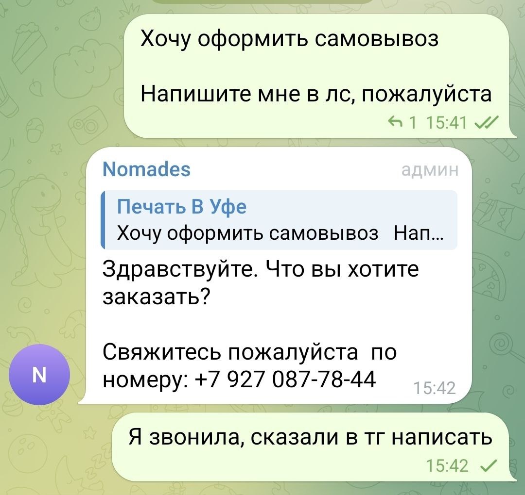 Хотела оформить самовывоз в Номадес. Я позвонила, сказали к номеру привязан тг, в итоге тг по их номеру не находит. Написала в чат канала. Они так же говорят напишите нам в лс 😁 В итоге попросили ник и пропали, написали мне аж 16:46😁 в это время ко мне уже ехала еда из другого места Сейчас на самом деле тяжело сделать заказ в ресторанах, где нет сайта. А звонить я не люблю 😁 Поэтому просьба ко всем ресторанам, кто меня читает, сделайте тг аккаунты, чтобы вам можно было написать 😊 А в Номадес я обязательно сделаю заказ, в следующий раз Ставь ❤️ - если тоже не любишь звонить и когда звонят тебе