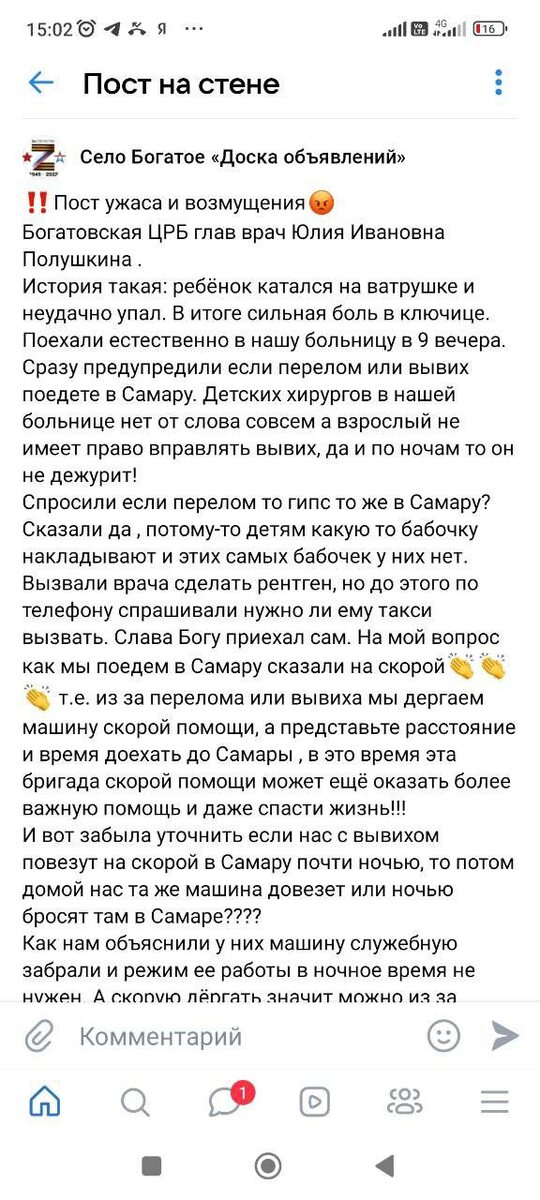 Но из официального ответа Министерства здравоохранения Самарской области внезапно «всплыл» вопрос объединения Богатовской центральной районной больницы с Кинель-Черкасской ЦРБ. Естественно, без публичных обсуждений, без диалога с жителями и без учёта реальных условий жизни района Формально всё, как обычно, выглядит спокойно. Людей успокаивают, мол, вопрос рассматривается», «переживать не о чем», «штат и финансирование сохранятся», лишь бы не было лишнего шума. Но на практике, как рассказывают местные жители, ситуация уже сейчас близка к катастрофе Рассказывают, что в районе критически не хватает врачей. Хирург на полставки, пенсионного возраста, с серьёзными проблемами со здоровьем. Второй специалист приезжает из соседнего района, появляется на приёме на пару часов и не оперирует. Запись к врачу закрывается в первые дни месяца, несмотря на заявления о «свободных слотах». Людям предлагают подождать 27 дней или ехать куда-то ещё за свой счёт. Тем временем Министерство здравоохранения в