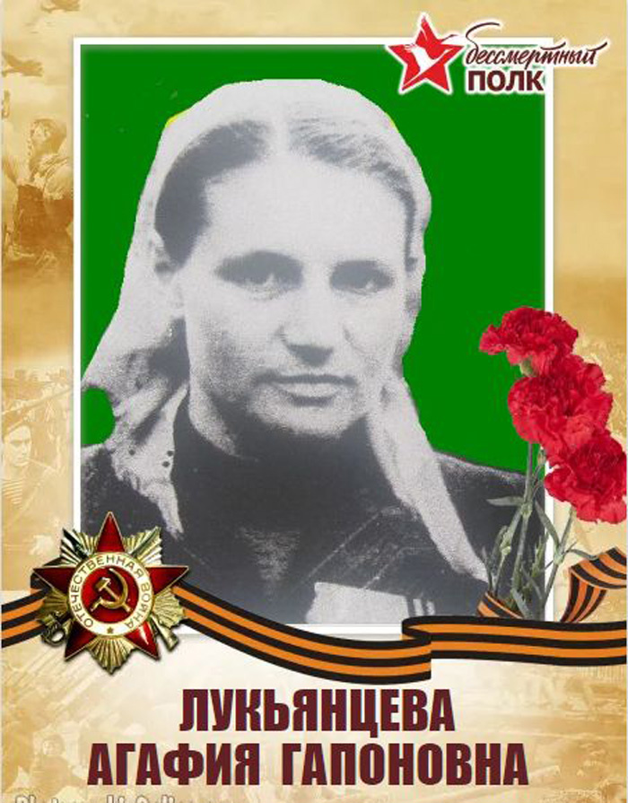 Агафья Гапоновна Лукьянцева, тогда еще Овчаренко, родилась в 1924 году в Туриловке. Училась в школе, была девушкой активной. Когда ей исполнилось 14 лет, вступила в комсомол. На момент начала Великой Отечественной ей исполнилось 17 лет. Вместе с односельчанами работала в колхозе. А в мае 1943-го ушла добровольцем на фронт. Звание у нее было самое простое: гвардии рядовой, фронтовые обязанности — топографист. Место службы — 117-й гвардейский артиллерийский полк 118-й стрелковой дивизии. Существует выражение «У войны – не женское лицо». Убеждаешься в обратном, изучая документы фронтовой жизни нашей землячки. В экстремальных условиях военных операций женщины-солдатки проявляли себя геройски, мужественно и храбро, защищая Родину. Свою первую награду — медаль «За боевые заслуги» Агафья Гапоновна Овчаренко заслужила 31 декабря 1944 года. В выписке из приказа о награждении сказано: «В своей повседневной работе, не считаясь с личным временем и отдыхом, товарищ Овчаренко своевременно выполняла