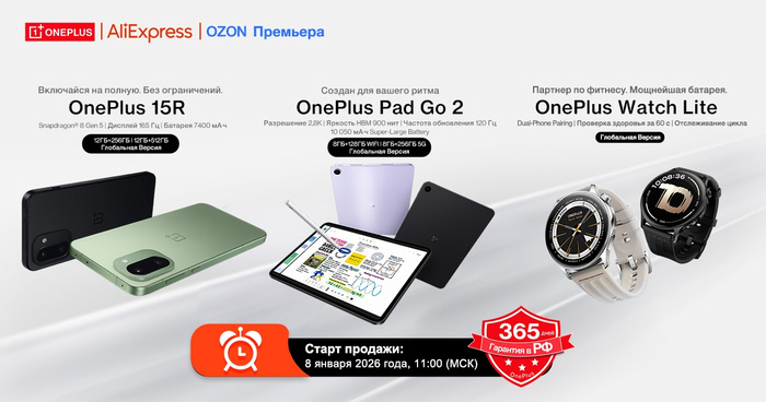 8 января в 11:00 по московскому времени компания OnePlus официально откроет продажи новых устройств для российского рынка. Среди ожидаемых гаджетов представлены три модели: OnePlus представляет OnePlus 15R — флагман с лучшим соотношением цены и возможностей Новый смартфон сочетает мощнейший совместно разработанный чипсет, рекордную батарею, великолепный дисплей и быстрый, плавный софт для максимальной производительности — особенно в играх OnePlus 15R — новый флагман с оптимальным соотношением цены и возможностей. Устройство, ставшее второй моделью серии OnePlus 15, уже поступило в продажу в Индии, Европе и Северной Америке. OnePlus 15R — первый смартфон в мире, вышедший на глобальный рынок с новым мобильным процессором Qualcomm Snapdragon® 8 Gen 5, совместно разработанным OnePlus и Qualcomm. Новинка предлагает выдающуюся производительность, рекордную автономность и быстрый, плавный пользовательский опыт — начиная с цены PRICE. «Одна из ключевых философий OnePlus — никогда не останавли