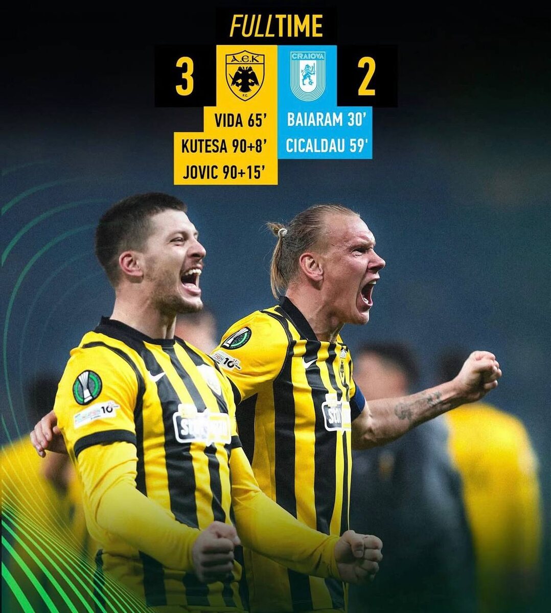 ☕️ Вчера прошел шестой тур Лиги Конференций, там и Кристал Пэлас дома неожиданно ничью скатал со скромным финским КУпСом, и Фиорентина проиграла Лозанне 🤝 🔥 Но я хотел бы подсветить камбэк греческого АЕКа, которым руководит Марко Николич. Его команда до 65-й минуты летела 0:2, и мощнеший натиск в конце игры позволил перевернуть результат в пользу хозяев. АЕК в общей таблице занимает 3 место, но тут такая плотность, что от 14-ого места отрыв всего 3 очка 😀🤷♂️ ➡️ Подписаться на ФутХайп