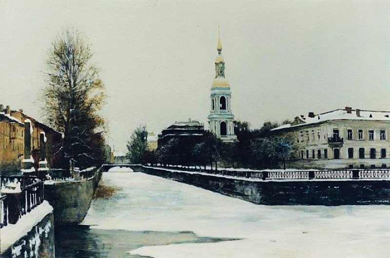 Нынешний март иллюстрационно представлен работами замечательных художников разных эпох. На картине нашего современника Виктора Егорова - любимая моя Коломна, Крюков канал - вид совершенно вневременной, как бы застывший сам в себе. Должно быть и 200 лет назад мартом примерно то же видели местные обитатели, ежась от зябкой столичной сырости, бегло осеняли себя крестом на колокольню Николы Морского и, огибая расплывшиеся лужи, пробегали по своим делам мимо. А на картине ниже художника второй половины века XIX-го Федора Васильева - уже растеплелось, снега не осталось вовсе... Да где же это? Место неуловимо-знакомое, но опознать его наверняка не возьмусь, угадываются лишь неверные очертания Петербурга. Фигура в верхнем правом углу напомнила мне гоголевского Подколесина: "Какой это смелый русский народ! А работники. Стоит на самой верхушке… Я проходил мимо дома, так щекатурщик штукатурит и не боится ничего..."