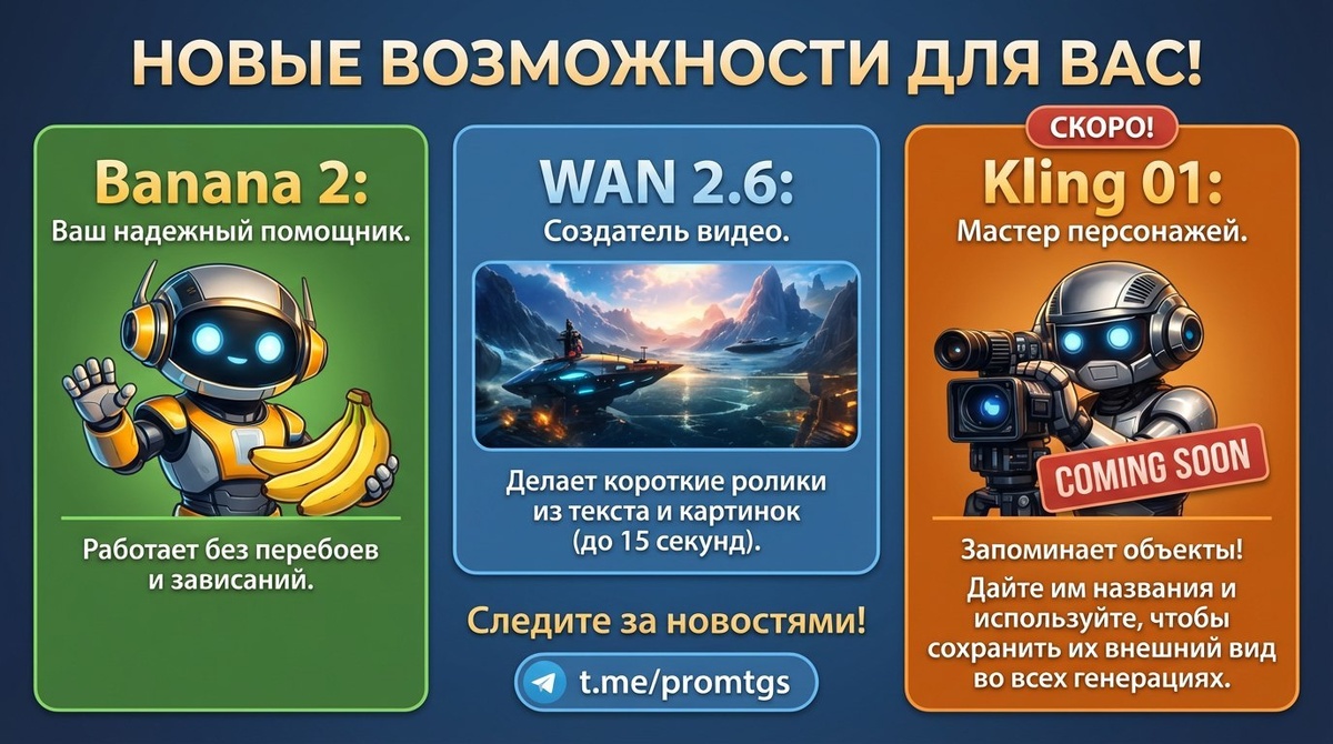 : 1. Усилили ресурсы Banana 2 - теперь нет отказов из за перегрузки серверов Google, стало стабильнее. 2. WAN 2.6 уже обновили (это генератор видео) - модель стала умнее и поддерживает видео до 15 секунд. Отдельно: добавили качество 480рix- на нём цена на WAN ниже в 2 раза, тариф доступен для WAN 2.5. 3. Скоро выпустим Kling O1 (новая версия генерации видео): появятся элементы - бот запоминает внешний вид объекта, и дальше при вызове по названию объекта в запросе будет сохранять этот внешний вид в следующих генерациях. Полный доступ ко всем функциям, без урезаний. Следите за обновлениями в нашем канале: https://dzen.ru/id/68e7eef736827c1621bc5d32 И что официально нового в WAN 2.6 простыми словами: - Можно загрузить короткий референс с персонажем, и дальше генерировать новые сцены так, чтобы сохранялись внешность и голос. - Лучше получается делать ролики “как история” из нескольких сцен, чтобы видео выглядело цельно. - Улучшили синхронизацию звука и картинки, стало больше реалистич