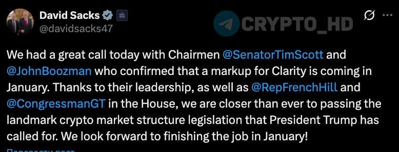 🇺🇸 Дэвид Сакс: Сенат США вернется к доработке/рассмотрению законопроекта о структуре криптовалютного рынка (CLARITY) в январе 2026 года.