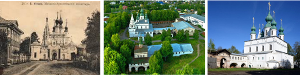 Михайло-Архангельский монастырь на фотографии начала двадцатого века и в наше время (в пожаре случившимся в 1651 году деревянный монастырь полностью сгорел и на его месте поставили каменное монастырское строение со всеми необходимыми для этого постройками. В 1919 году монастырь был закрыт и использовался в разных не церковных назначениях до 1991 года. Сегодня этот отреставрированный, но не действующий монастырь входит в музейный комплекс Великого Устюга).