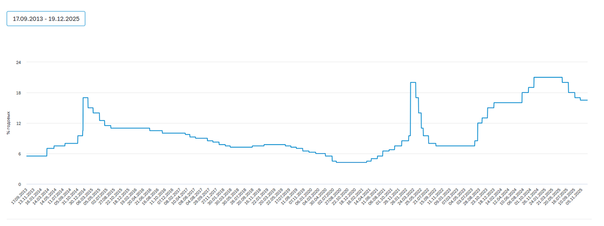 Чётко видны три(четыре) лоя и три(четыре) хая. Лои: 1)до февраля 2014 3)август 2020-апрель 2021. 4)сентябрь 2022 - июль 2023. Хаи: 1)декабрь 2014 - январь 2015, 3)март-апрель 2022, 4)октябрь 2024-июнь 2025. Кроме того, если долго и пристально вглядываться в график, то можно увидеть лой 2)март-сентябрь 2018 и хай 2)декабрь 2018-июнь 2019. Но из-за сильной стёртости и слабой амплитудности эти лой+хай могут узреть только просветлённые (такие как я). Кроме того, к хаю можно отнести и период в 2009г, когда ЦБРФ держал ставку 10% - всего-то, но зато целый год. Уж не помню. как ставка ЦБ тогда официально называлась. Итак, ряд хаёв: 10%; 17%; 7,25%; 20%; 21%. Ряд лоёв: 5,5%; 7,25%; 4,25%; 7,5%. Совершенно чётко видна периодичность в 7 лет, причём имеются 2 ряда событий, наложенных друг на друга. 1й ряд: всплески Ставки имеющие пикообразный вид, это хаи 2015 и 2022гг. Резкий подъём, быстрый спуск. Это - реакции ЦБРФ на тяжелые, явные и (относительно) внезапные угрозы, грозившие обрушением курса