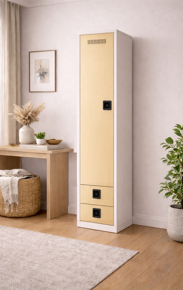 На первый взгляд этот шкаф выглядит как нейтральный элемент интерьера. Однако за сдержанной геометрией стоит продукт инженерного расчёта, а не декоративного компромисса.
