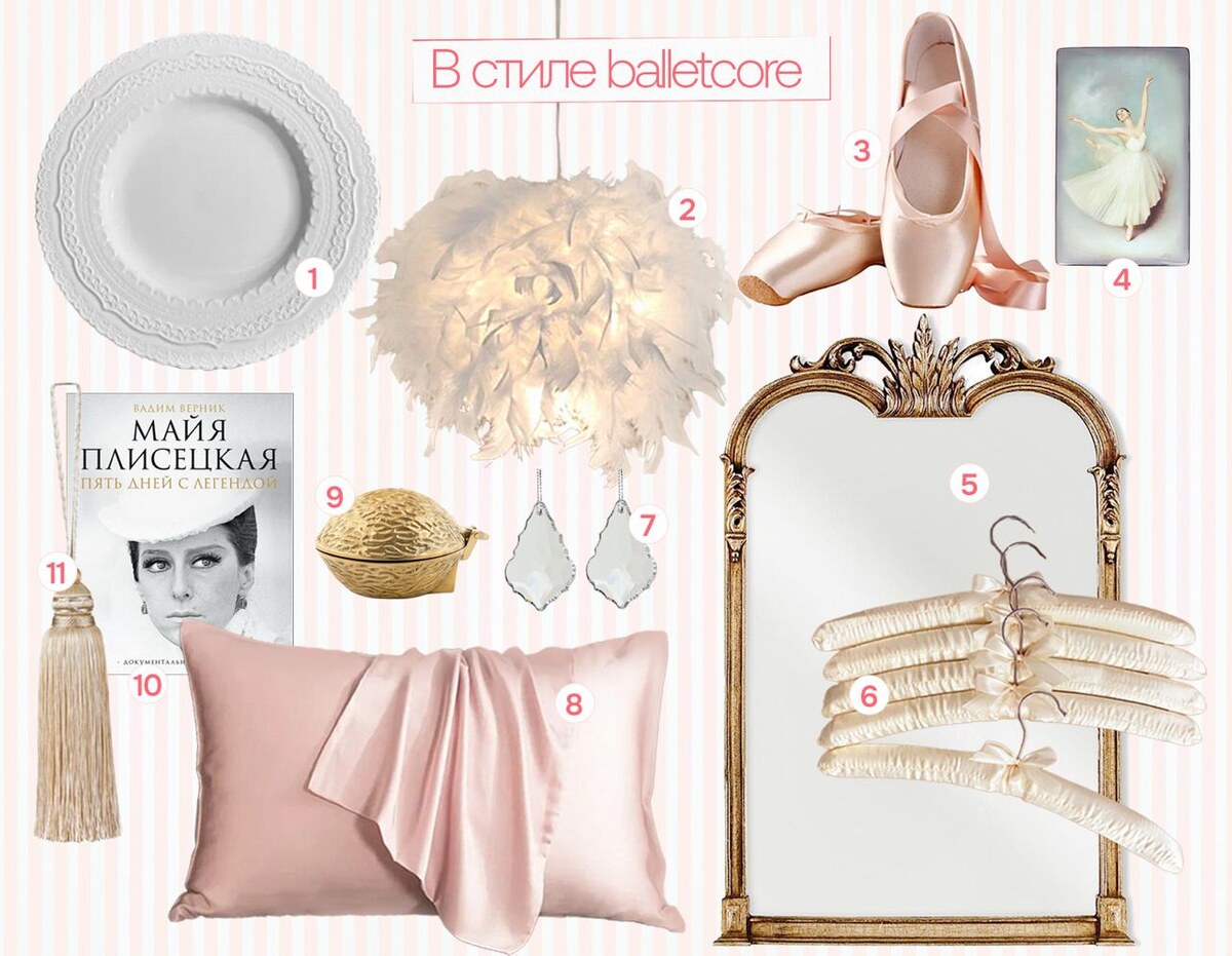 Нежная подборка для интерьера в стиле balletcore: (1) тарелка, (2) люстра, (3) пуанты, (4) лаковая шкатулка, (5) зеркало, (6) плечики, (7