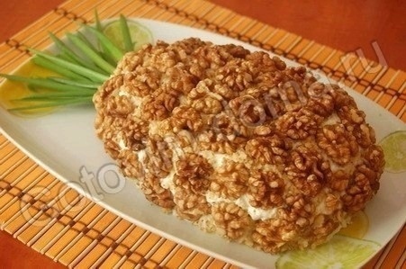 Грецкие орехи можно заменить ломтиками консервированных шампиньонов, украсив ими поверхность салата в виде чешуек ананаса, выкладывая ломтики грибов немного внахлест.
