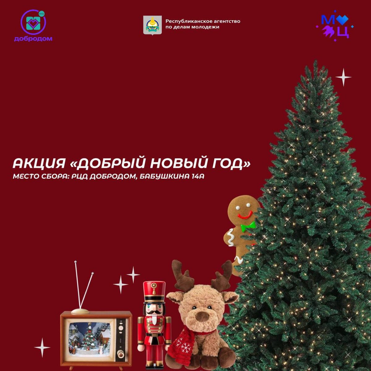❤️ 🎄Знаете, откуда начинается Новый год? Он начинается не с боя курантов. Он начинается с тихого блеска шарика на ёлке. С запаха хвои и тёплого света гирлянды в темноте. С того волшебного момента, когда дом наполняется уютом и ожиданием чуда. Республиканское агентство по делам молодежи запускает акцию «Добрый Новый год», чтобы подарить не просто игрушки, а частичку тепла, заботы и внимания тем, кто в этом сейчас особенно нуждается. 🫶🏻 ❤️В этом году наш сбор адресован одиноким членам семей, погибших участников специальной военной операции. 🎄🎄🎄🎄🎄🎄🎄🎄 Что мы собираем? Всё, что создаёт праздник: 🔴Ёлочные игрушки (новые или в хорошем состоянии) 🔴Искусственная ёлочка (любого размера) 🔴Мишура, гирлянды, дождик 🔴Новогодние украшения для дома ❤️Каждая вещь, которую вы принесёте, — это не просто безделушка. Для кого-то это — первый шарик на ёлке добра и надежд. Это праздник, который мы можем устроить вместе. 📌Всё можно принести по адресу: г. Улан-Удэ, ул. Бабушкина, 14а, Р