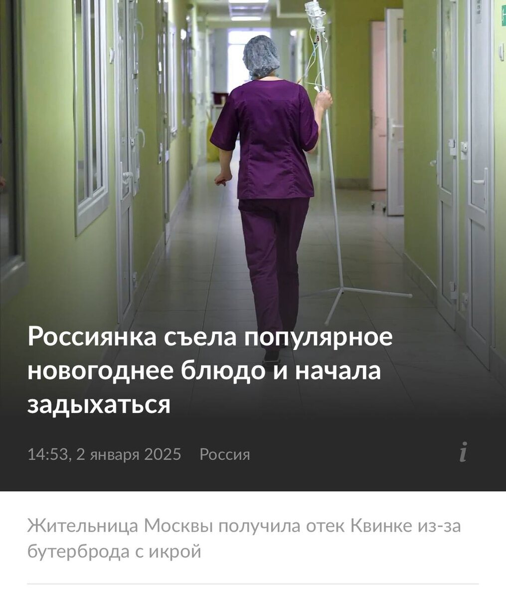 А прошлом году в новогоднюю ночь жительница Москвы стала жертвой серьезной аллергической реакции. 25-летняя девушка получила отек Квинке после того, как съела бутерброд с красной икрой, привезенной с Сахалина. Вечером 31 декабря она гостила у родителей своего молодого человека, где её угостили популярным новогодним деликатесом. 🔴 Что случилось? К полуночи у девушки распух язык, и она начала задыхаться. К счастью, скорая помощь приехала вовремя, и медики сделали два укола, после чего она пришла в себя. Оказавшись в больнице, выяснилось, что у неё аллергия на красную икру, чего она даже не подозревала. До этого момента никаких проблем с деликатесом не было. Напишите в комментариях, в Новый год вы выбираете блюда попроще, или тоже любите морепродукты и деликатесы?👇