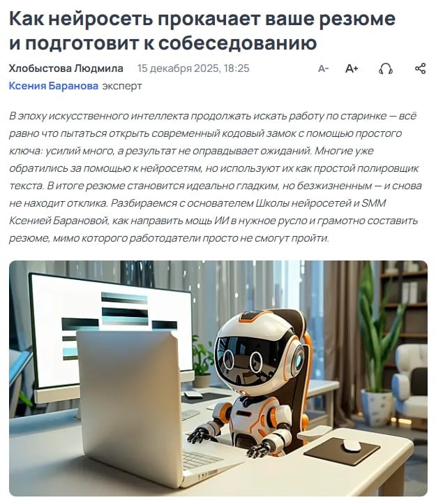 Заранее проигрышный вариант. ❗В новой статье для Рамблера я рассказываю, как превратить нейросеть в карьерного стратега: — как с её помощью вытащить из опыта реальные достижения, — какие вопросы вам с большой вероятностью зададут на собеседовании, — и почему гладкое, но безликое резюме сегодня проигрывает живому и осмысленному. ИИ уже читают резюме быстрее людей. Вопрос только в том, на чьей он стороне — вашей или рекрутера. Читать статью 👇 https://www.rambler.ru/pro/produktivnost/55753453-kak-neyroset-prokachaet-vashe-rezyume-i-podgotovit-k-sobesedovaniyu/ А вы уже пробовали использовать нейросети для поиска работы или пока делаете всё «вручную»? P.S. ❗А теперь другая реальность. Как только хотя бы часть этих задач берут на себя ИИ-агенты, вы неожиданно обнаруживаете, что: ✔️ у вас появляется 2–4 свободных часа ежедневно ✔️ в голове — место для творчества, стратегии и развития ✔️ рутинные процессы перестают давить ✔️ рабочий день перестаёт быть бесконечной пожарной станцией �