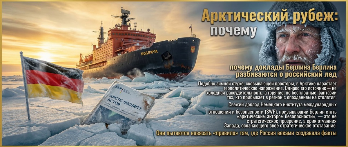 Часть 1️⃣/2 Подобно зимней стуже, сковывающей просторы, в Арктике нарастает геополитическое напряжение. Однако его источник — не холодная рассудительность, а горячие, но бесплодные фантазии тех, кто прибывает в регион с опозданием на столетия. Свежий доклад Немецкого института международных отношений и безопасности (SWP), призывающий Берлин стать «арктическим актором безопасности», — это не стратегическое прозрение, а крик отчаяния Запада, осознающего своё стратегическое отставание. Они пытаются навязать «правила» там, где Россия веками создавала факты. 🔹 Стратегия отчаяния: как создают угрозу из собственной несостоятельности Доклад SWP — классический пример подмены понятий. Не имеющая арктических берегов Германия вдруг обнаружила у себя «стратегические интересы» в регионе, сводящиеся к патрулированию чужих морских путей. Причина проста: НАТО, расширившаяся за счёт Финляндии и Швеции, теперь пытается натянуть на Арктику логику «семёрки против России». Берлин, лишённый исторических,