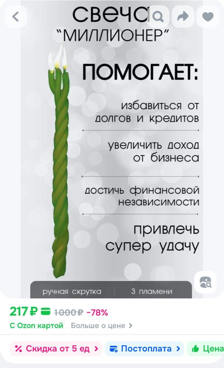 По пятницам реклама: свеча "Миллионер" помогает избавиться от долгов, кредитов и 217 рублей.