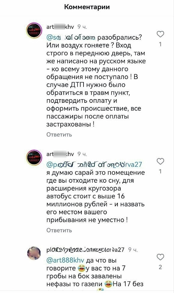 Хабаровчане массово выражают недовольство работой частного перевозчика Данила Артамонова, обслуживающего городские маршруты №№ 8, 35 и 1С, а также пригородные №№ 104 и 123 и некоторые другие. К слову, один из них ранее оказался в центре скандала из‑за инцидента с пожарной машиной. В редакцию обратилась местная жительница, ставшая свидетелем конфликта предпринимателя и пассажирки. В одном из пабликов вспыхнул серьезный спор по поводу состояния транспорта на линии. Одна из пассажирок емко описала состояние автобусов. В комментариях она заявила, что они напоминают «сарай». Вероятно, такое сравнение задело Данила Артамонова, но вместо конструктивного диалога он ответил в том же ключе, назвав «сараем» дом собеседницы. - Сарай - это еще мягко сказали, в салоне грязь, холод, часто в рейсы не выходят. А управы-то на частников нет, - отметила женщина. Редакция предприняла несколько попыток связаться Данилом Артамоновым, чтобы получить комментарий по сложившейся ситуации. Номер, указанный в отк