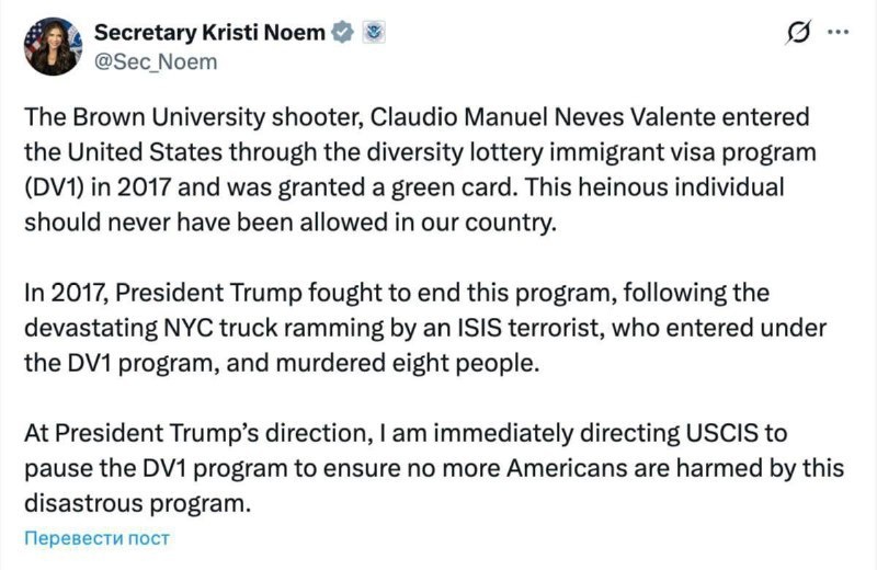 поводом стало то, что подозреваемый в стрельбе в Брауновском университете оказался в стране именно благодаря этой программе, заявила министр внутренней безопасности Кристи Ноэм.
