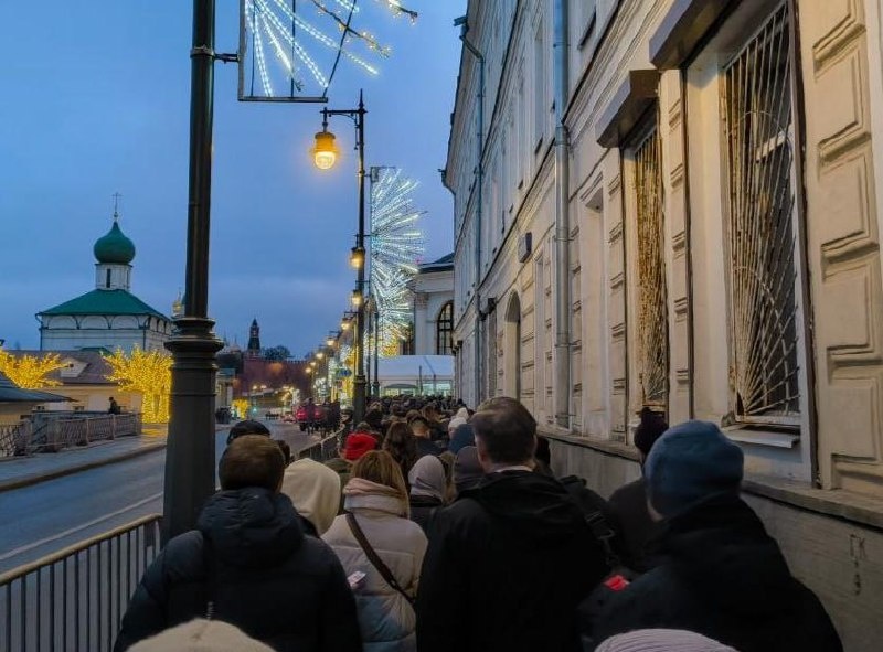 Очередь из журналистов у входа в Гостиный двор в Москве, где сегодня состоится прямая линия и большая пресс-конференция Владимира Путина.